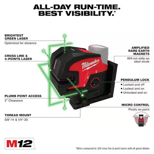 Our M12™ Green Cross Line & Plumb Points Laser provides you with all day runtime and best visibility in its class. Get 15+ hours of continuous ...